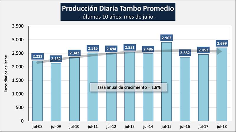 Sobre la base de la producción mensual y la cantidad de tambos, podemos inferir el tamaño del tambo promedio, unos 2.700 litros de leche diarios para julio de 2018, un 10,0% más que el año anterior. Si evaluamos su comportamiento en el tiempo, a pesar de la disminución en el número de unidades productivas y en el número de vacas, el tambo promedio presenta en el período 2008-2018 una tasa de crecimiento acumulada anual del 2,0%, lo que permite el sostenimiento de los niveles productivos agregados a nivel país.