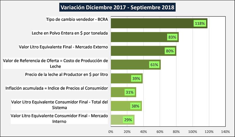 Entre el mes de diciembre de 2017 y septiembre de 2018 el precio del dólar se incrementó en un 118%, nuestro principal producto de exportación (leche en polvo entera) presentó una caída en dólares FOB por tonelada, pero sintió todo el impacto favorable de la devaluación menos la reducción de reintegros y la implantación de los derechos de exportación. Este efecto repercute en el valor por litro equivalente de mercado externo medido en pesos, que se incrementa en el período un 80%.