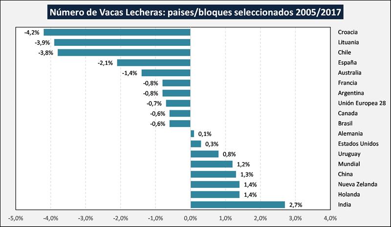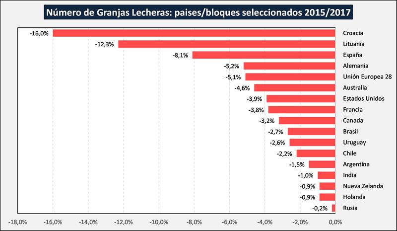 Con la información del Bulletin N° 494/2018 The World Dairy Situation 2018 of the International Dairy Federation IDF/FIL se presenta una comparación de la evolución (tasa anual de variación) del número de granjas lecheras en países y bloques seleccionados (tambos) y en el número de vacas lecheras.