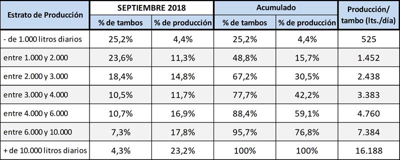 Los 465 tambos del estrato superior y que tienen 16.188 litros de promedio de producción diaria en septiembre de 2018, generan igual volumen de leche que 6.231 tambos del los estratos de menos de 2.500 litros (1.208 litros diarios promedio).