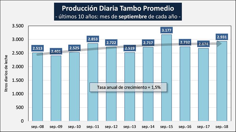 El tambo promedio en septiembre de 2018 tuvo una producción de 2.931 litros diarios lo que representa un incremento del 9,6% respecto al año anterior. La tasa anual acumulada de crecimiento de la producción promedio por tambo, es del 1,5% en los últimos 10 años.
