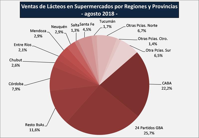 La distribución de esas ventas en el territorio nacional se visualiza en el gráfico siguiente, donde es de remarcar que la provincia de Buenos Aires representa el 59,5% de las ventas de lácteos en supermercados de todo el país, incidencia que ha disminuido en los últimos meses.