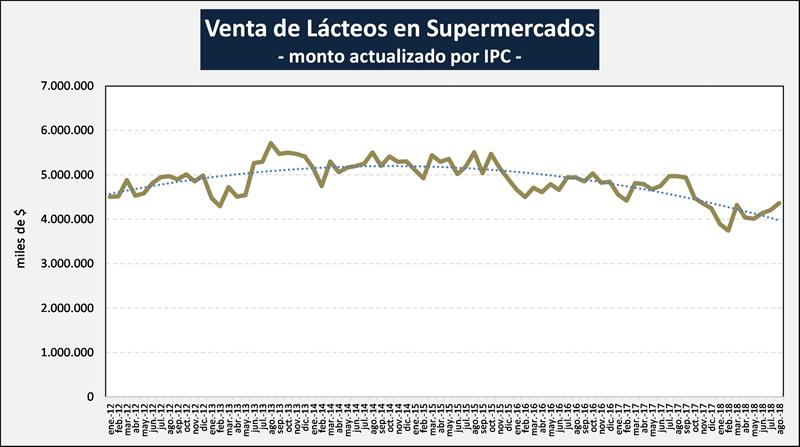 Respecto a la venta de lácteos en los supermercados según los datos de INDEC, fueron de $ 4.364.707 (miles) para el mes de agosto de 2018, lo que representa un incremento del 7,8% respecto al mes anterior y un 21,2% más que agosto de 2017.
