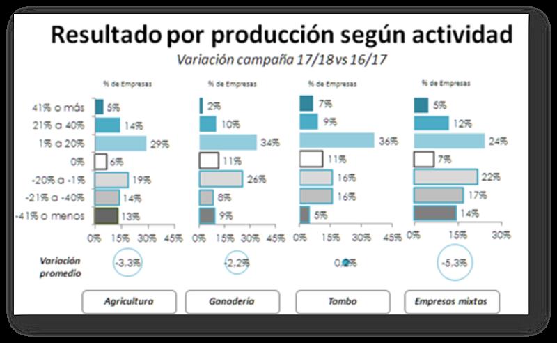 En promedio, las empresas agrícolas encuestadas registraron en 2017/18 un resultado por producción 3,3% inferior respecto de 2016/17, mientras que esa caída en las ganaderas y mixtas fue de 2,2% y 5,3% respectivamente.