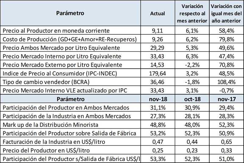 En el cuadro se puede observar que el precio al productor tuvo un incremento interanual del 58,4% que supera el índice minorista de precios (48,5%) pero como indicamos en nuestro informe de costos, no alcanza a cubrir el considerado precio de equilibrio (costo total de producción + rentabilidad del 5% al capital invertido) que para noviembre fue de $ 10,74/litro de leche.