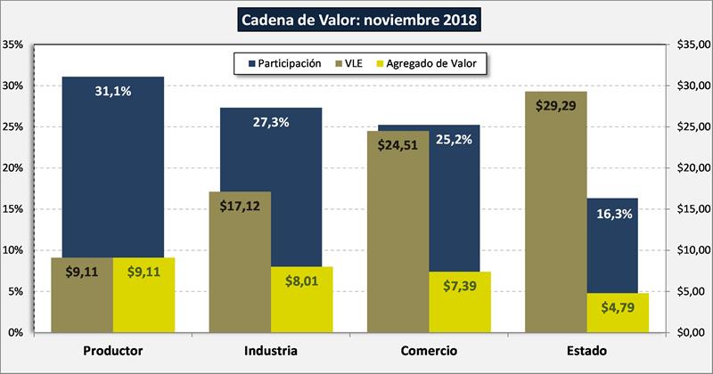 Mejora también la participación del productor en el valor de salida de fábrica (al que vende la industria), alcanzando el 53,2%. Y el margen entre el valor de salida de fábrica y el precio final que paga el consumidor en el mercado doméstico se redujo al 48,8% cuando un año atrás alcanzaba el 52,3% (mark up), donde cabe acotar que ese margen no es neto y además incluye costos de distribución y logística.