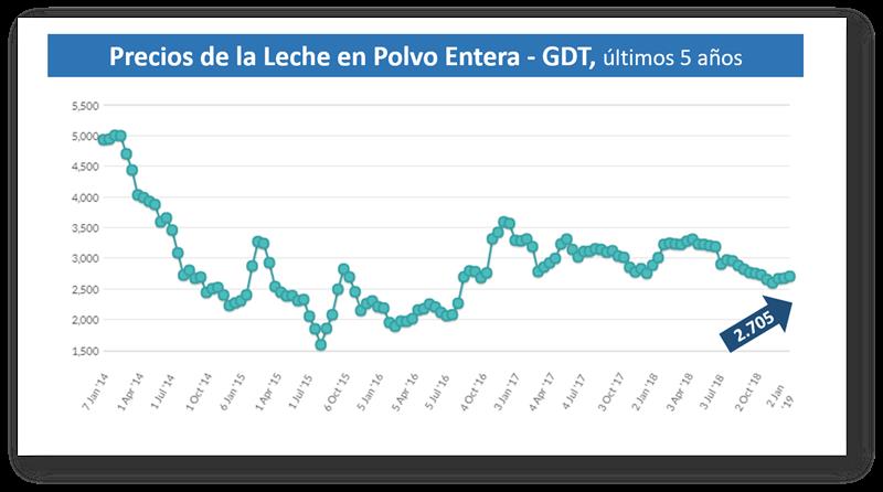 El año 2019 comienza con una suba importante de todas las commodities que se comercializan en la subasta quincenal del Global Dairy Trade. Ésta es la tercera suba consecutiva, lo cual puede marcar una tendencia de recuperación de los precios, fundamentalmente de la Leche en Polvo Entera (nuestro principal producto de exportación), que como puede verse en el gráfico siguiente alcanzó un valor de 2.705 dólares por tonelada, cuando a finales de 2016 cotizaba por encima de los 3.500 dólares.