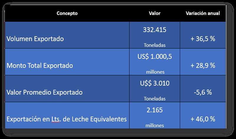 Los principales productos exportados en volumen fueron las leches en polvo (53% del total) y los quesos (18%). Estos productos tuvieron una crecimiento interanual acumulado del 91,5% los primeros y 35,3% los segundos, como puede observarse en el gráfico siguiente.