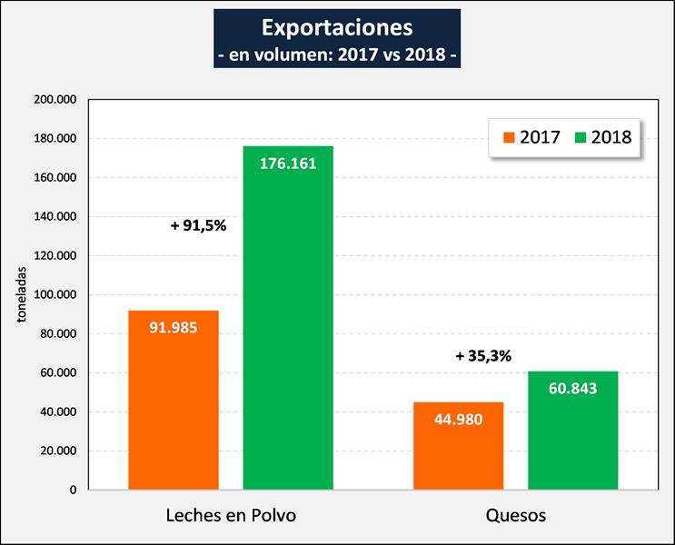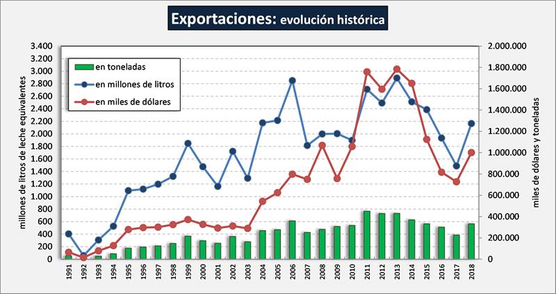 Si transformamos los productos exportados en 2018 a litros equivalentes, alcanzamos los 2.165 millones de litros de leche que comparados con la producción total de 10.527 millones de litros, representan una participación de las exportaciones del 20,6%, lo cual indica un crecimiento de participación del 40% ya que las exportaciones de 2017 insumieron el 14,7% de la producción total. El crecimiento en litros de leche necesarios para producir los productos exportados fue del 46,0% entre 2018 y 2017.