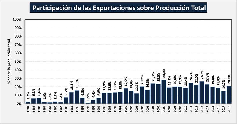 En el gráfico siguiente se puede observar el incremento de participación experimentado por las exportaciones respecto a la producción total nacional en 2018, que es el mejor valor logrado desde 2014 y está algo por encima de la media de los últimos 20 años (20,6% respecto de 20,2%).