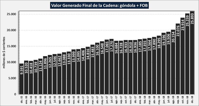 En el gráfico de arriba se puede observar la “facturación” total de la cadena de valor que en el mes de diciembre de 2018 fue de $ 25.893 millones lo que representa un incremento del 2,6% respecto al mes anterior y del 52,9% en comparación con igual mes del año anterior.