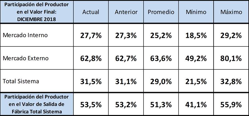 Por último el mark up comercial (diferencia relativa entre el valor de salida de fábrica y valor que paga el consumidor neto de impuestos a la venta), en diciembre de 2018 fue del 47,7%, cuando el mes pasado fue del 48,8% y un año atrás del 52,1%. Además cabe acotar que ese margen es bruto, no neto y dentro de él se incluyen valores de logística y distribución.