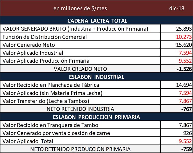 Por último mostramos en balance que resume el resultado de la cadena en su totalidad y para cada uno de los dos eslabones principales que la componen. El resultado mensual arroja un valor neto creado negativo de $ 1.525 millones. Todos los meses del año presentaron resultados negativos para la cadena en su conjunto y sobre todo para el eslabón primario (70/30), pero diciembre se caracteriza por ser el mes donde el resultado adverso del sector industrial supera al del sector primario.