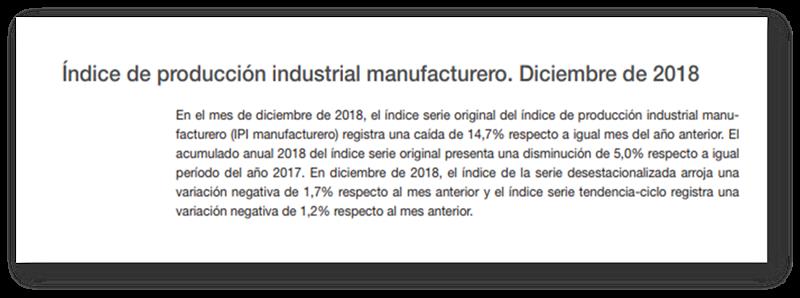 El IPI manufacturero es un indicador de coyuntura, con periodicidad mensual, que tiene como principal objetivo medir la evolución de la producción de la industria manufacturera de manera objetiva, oportuna, con precisión, coherencia, comparabilidad, de modo imparcial, dentro del marco de los principios reconocidos y las recomendaciones internacionales en la elaboración de estadísticas públicas oficiales.