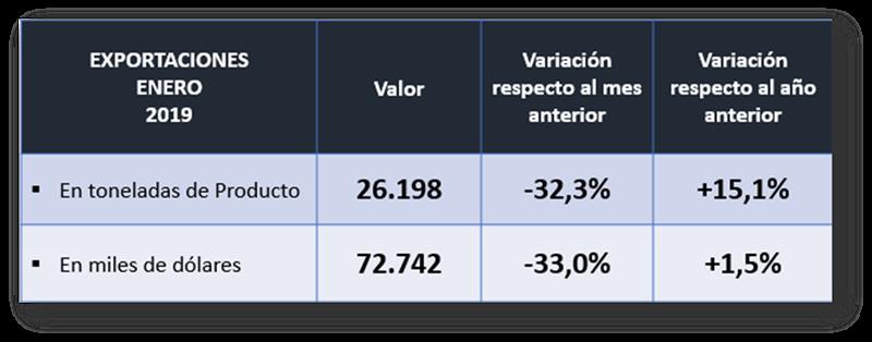 En enero de 2019 las exportaciones de productos lácteos fueron de 26.198 toneladas por un valor de US$ 72,7 millones, lo que representa una disminución del 32,2% y 33,0% respectivamente en comparación con el mes anterior y un incremento de 15,1% en volumen comparado con enero 2018 y +1,5% en valor para igual mes del año pasado. Se dio una importante caída en el volumen del Resto de Productos y en el valor unitario promedio de las exportaciones (-11,9%). Cabe acotar que en la comparación intermensual lo estamos haciendo con diciembre de 2018 que fue el más alto de los últimos 5 años para dicho mes.