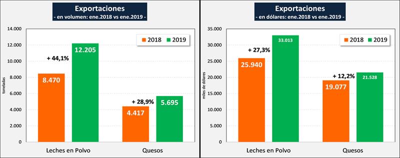 Los dos principales rubros de exportación, las leches en polvo y los quesos, tuvieron en enero de 2019 la evolución que muestran los gráficos comparados con igual mes del año anterior: