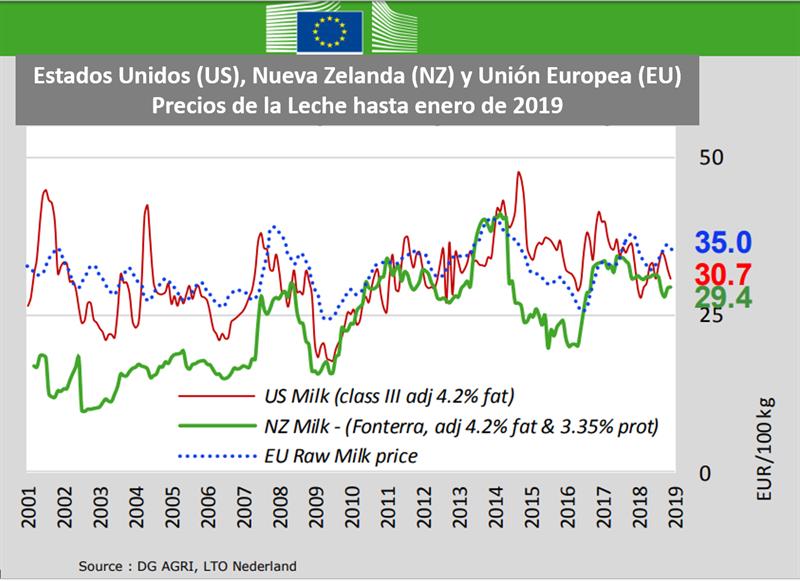 ·         Los precios medios de la leche de granja en la UE disminuyeron un 1,4% en enero de 2019, a 35,03 centavos/kg.