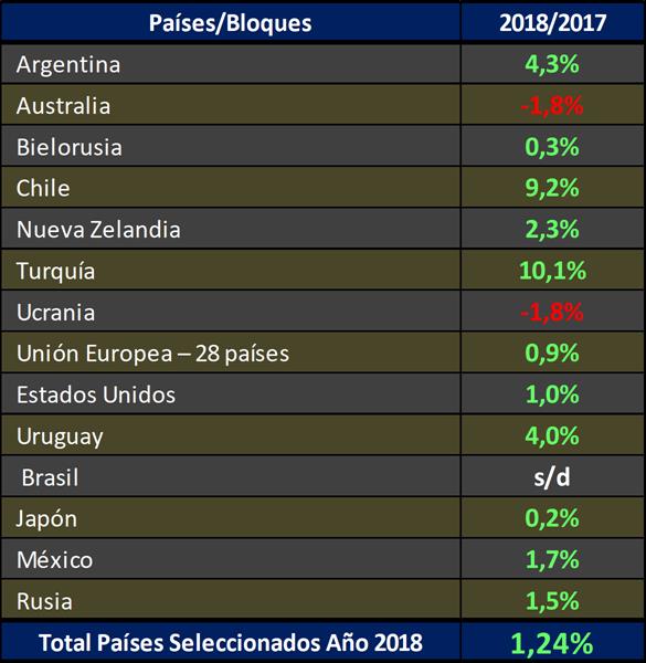 En el cuadro siguiente se toma un grupo seleccionado de los principales países productores e importadores que representan alrededor del 60% de la producción mundial de leche de vaca, en el cual se puede observar un crecimiento de la producción del 1,24%, para el año 2018 respecto a 2017. Cabe mencionar que se observa una marcada desaceleración del crecimiento de la producción mundial de leche de vaca, ya que en los primeros meses del año, el crecimiento superaba el 2%.