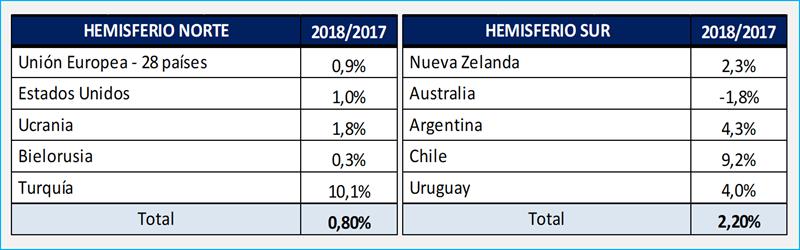 Continúa el crecimiento en USA y en la UE-28 (+1,0% y +0,9%, respectivamente) pero a menores tasas y NZ remonta firmemente un crecimiento luego de una inicial caída, ahora con un crecimiento del 2,3%. El comportamiento de la producción ponderada de ambos hemisferios teniendo en cuenta los países exportadores, marca una mejor perfomance para el hemisferio sur, teniendo en cuenta que en los países seleccionados, el hemisferio sur es sólo el 15% de la producción de los países seleccionados del hemisferio norte.