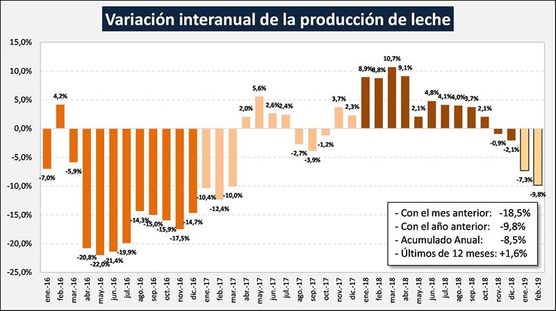 En el mes de febrero de 2019 la producción fue de 668,3 millones de litros de leche, este valor representa una disminución del 18,5% respecto al mes anterior (cabe acotar que eso es mes contra mes, en lo que respecta al promedio diario, ya que son 28 días contra 31, la caída fue del 9,8% intermensual) y una caída del 9,8% en comparación con igual mes del año anterior. El acumulado de los dos primeros meses de 2019 arrastra una caída del 8,5% respecto a 2018. La media móvil de los últimos 12 meses indica un crecimiento interanual del 1,6%.