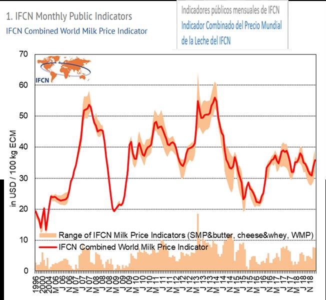 El Indicador combinado IFCN del Precio Mundial de la Leche ilustra el nivel de precios de leche en el mercado mundial. Representa el valor teórico que un procesador podría pagar a sus remitentes, comercializando sus productos en el mercado mundial y operando con costos industriales estándar.