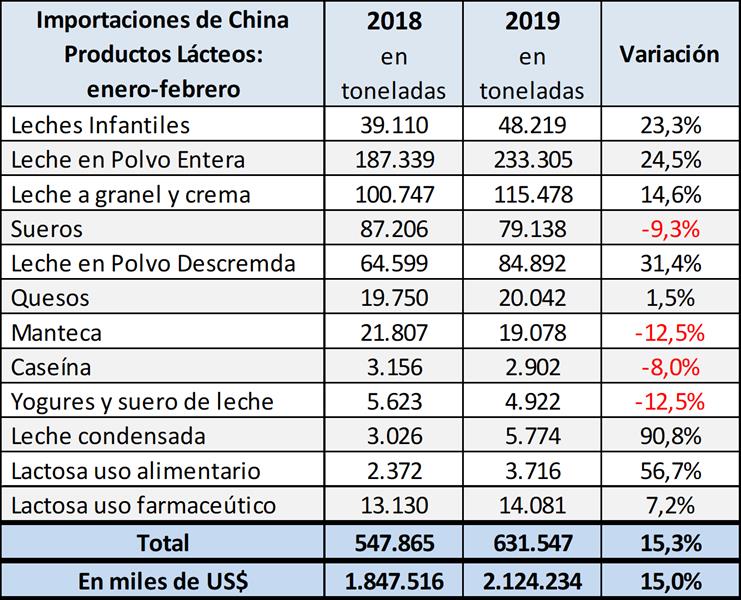 Las importaciones chinas de productos lácteos también continúan de manera expedita en febrero. El aumento en comparación con el mes de febrero del año pasado es del 11% en cantidad y del 5,5% en valor, con un fuerte crecimiento en el porcentaje de importaciones de leche en polvo descremada (LPD), leche y crema, lactosa para uso farmacéutico, leche condensada, y lactosa para uso alimentario.