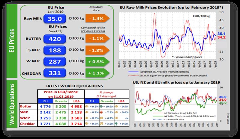 Tablero del Observatorio Europeo del Mercado Lácteo 5/4/2019· El precio promedio de la leche de granja en la UE en febrero de 2019 es estable en comparación con enero: Euros 34,94 centavos/kg. Este nivel de precios es 1,5% más alto que un año antes y 3,6% más alto que el promedio de los últimos 5 años. · En comparación con febrero de 2018, los precios aumentaron en la mayoría de los Estados miembros, los mayores aumentos de precios informados en Italia (+ 10,2%), Eslovenia (+ 7,7%), Letonia (+ 7,5%), Bélgica (7,5%), Estonia (+5,9) %) y Chipre (+ 5,9%). · En 20 Estados miembros, los precios mejoraron en comparación con el promedio de 5 años; en particular en República Checa (+ 12,3%), Letonia (+ 11,0%), Lituania (+ 9,7%), Italia (+ 8,2%), Estonia (+ 6,7%) y Francia (+ 6,5%). · Las estimaciones de los Estados miembros para marzo apuntan a un mismo nivel en precio de la leche que en febrero. · Precio de la leche en EE. UU. En febrero al mismo nivel que en enero: 31,1 centavos/kg (+ 12,3% en comparación con febrero de 2018). · Aumento leve en el precio de la leche en Nueva Zelanda (+ 1,3%) en febrero hasta 30,4 centavos/kg. (-1,3% en comparación con febrero de 2018) · En comparación con la semana anterior, los precios promedio de los productos lácteos y la LPD de la UE bajaron (-0,9% y -1,2% respectivamente), los precios de los lácteos promedios se encuentran relativamente estables. · Promedio de la LPD de la UE a 1.880 €/ton. (+ 43% por encima del nivel del año pasado); Manteca de la UE a 4.200 €/ton. (-12% respecto del año pasado). · El precio spot de la leche en Italia está disminuyendo estacionalmente en las últimas 8 semanas, ahora a 40,0 centavos/kg. (+ 34% por encima del nivel del año pasado). · Tendencias divergentes en las cotizaciones mundiales de productos lácteos expresadas en dólares estadounidenses en las últimas 2 semanas. · Los precios de los productos lácteos de la UE y los EE. UU. se han mantenido relativamente estables, excepto el queso cheddar de los EE. UU. · Aumento significativo de los precios de la manteca de Oceanía (+ 10,9%), LPE (+ 4,3%) y cheddar (+ 3,2%), mientras que el precio de Oceanía de la LPD disminuyó (-7,5%). · Oceanía se convirtió en el origen más caro para la manteca y es el más caro para la LPD y el queso cheddar. · Los productos lácteos de la UE son ahora los más competitivos, sin embargo, los precios del LPD y del cheddar de la UE y los EE. UU., están casi al mismo nivel. · El origen más caro es Estados Unidos para la LPE. · Aumento significativo de las exportaciones de LPE de EE. UU. y Uruguay en enero (+ 66% y + 60% respectivamente). · Rusia fue el segundo importador de queso en enero con un incremento del 7%. · Filipinas aumentó sus importaciones de LPD en un 36% en enero de 2019 en comparación con enero de 2018. ![]() traducido por el OCLA del European Milk Market Observatory