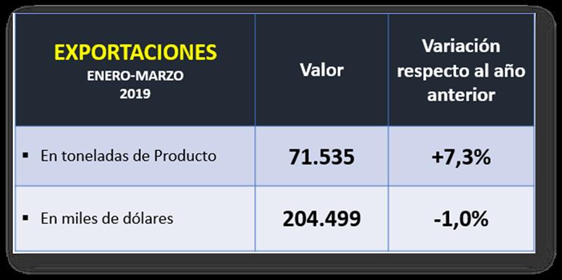 El mes de marzo en particular tuvo un volumen de exportación de 19.265 toneladas por un valor de US$ 55,4 millones, esto es -21,8% y -22,8% comparado con el mes anterior, respectivamente. Es dable aclarar que si igualamos en días ambos meses, la disminución es de 29,4% en volumen y 30,3% en valor.