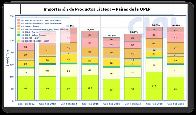 Importaciones de productos lácteos del área de la OPEP (la Organización de Países Exportadores de Petróleo, con sede en Viena, compuesta por Argelia, Angola, Ecuador, Irán, Iraq, Kuwait, Libia, Nigeria, Qatar, Arabia Saudita, Emiratos Árabes Unidos, y Venezuela) tuvo un crecimiento cero (-0,4%) en los primeros dos meses de 2018 en comparación con el mismo período del año anterior, tuvieron un crecimiento del 10,6% y en el primer bimestre de 2019, ese crecimiento logrado el año anterior se mantuvo prácticamente, sin variaciones (-0,4%).