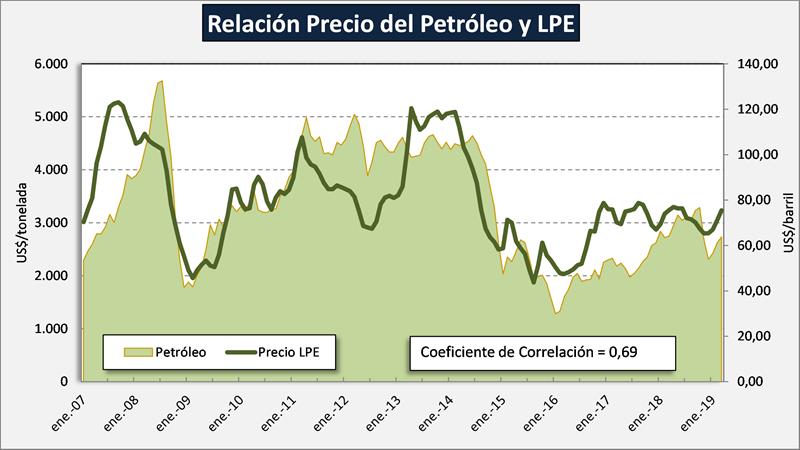 Elaborado por el OCLA con precio promedio LPE GDT-Oceanía-UE. Petróleo crudo precio promedio mensual en dólares por barril. Banco Mundial: Brent-WTI-Dubai Fateh.