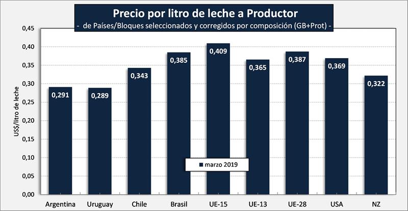 Observaciones: en el último gráfico los precios sólo se corrigen por composición de la leche (grasa butirosa y proteína) en los casos que están referenciados a un estándar (USA - UE y NZ) o se dispone de la composición promedio de la leche del país como es el caso de Uruguay y Argentina. No se corrigen por Recuento de Células Somáticas, Unidades Formadoras de Colonias ni Volumen (litros o kgs. mensuales), cosa que debería hacerse para mejorar la comparación, pero no se dispone por el momento de esos datos.