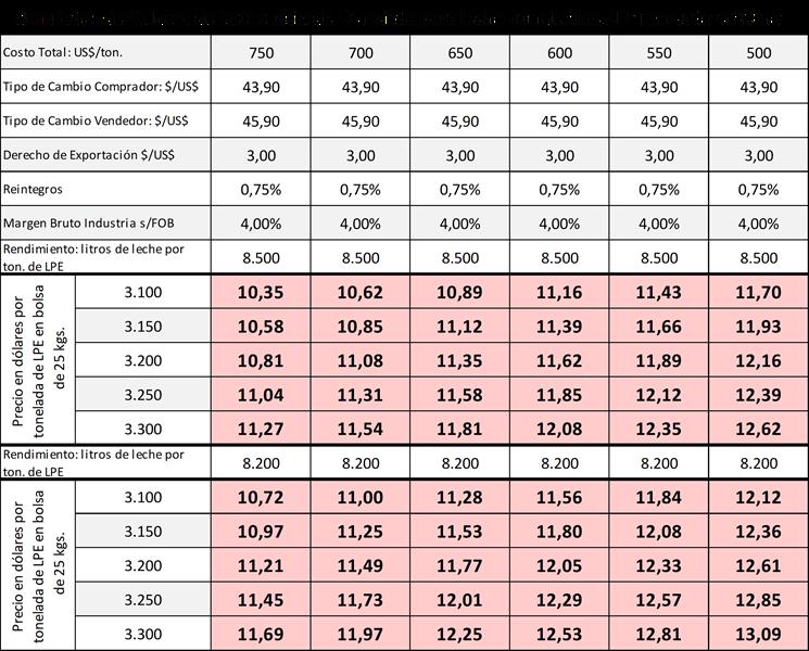 Las exportaciones representan en la actualidad el 22% del destino de la leche producida y aproximadamente el 31% de ellas corresponde en volumen y valor a leche en polvo entera (40% de la leche exportada en litros equivalentes). El cuadro de doble entrada tiene por un lado los valores de costos de elaboración y comercialización, el tipo de cambio, el derecho de exportación, el reintegro de impuestos, un margen industrial y la conversión de litros de leche a kilogramos de producto. Por otro lado el valor que se puede conseguir para la leche entera en polvo en bolsas de 25 kgs., en dólares por tonelada.