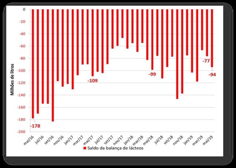 Por otro lado, en la comparación de mayo de 2019 con el mismo período del año pasado, la cantidad importada quedó 3% mayor. Además, los 10,7 millones de litros exportados por Brasil en mayo representan un aumento del 38% en relación a los 7,8 millones de litros en abril en equivalente de leche, ya en la comparación con may/18, el aumento fue del 187% . En el gráfico 1 se observa la evolución en el saldo de la balanza comercial láctea, que fue de -94 millones de litros en ese mes.