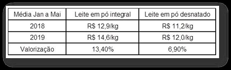 Si en diciembre de 2018 el valor medio de la leche en polvo integral negociado en Brasil era de R $ 13,1 / kg, en mayo de 2019 ese valor fue de R $ 15,0 / kg. Además del integral, el desnatado también presentó una fuerte subida, de R $ 10,6 / kg en diciembre de 2018, a R $ 13,1 / kg en mayo de 2019. Además, en la comparación con el acumulado hasta mayo del año los precios de las lechugas en polvo están bastante arriba en el acumulado año hasta mayo / 2019, como es posible observar en la tabla 1.