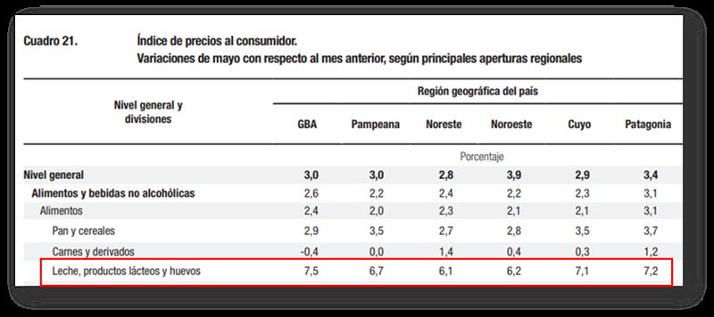 Según datos publicados por la Dirección General de Estadísticas y Censos - Ministerio de Hacienda del Gobierno de la Ciudad de Buenos Aires, los precios de los productos lácteos tuvieron un crecimiento mensual promedio del 8,4% e interanual del 86,5%.