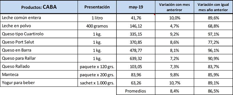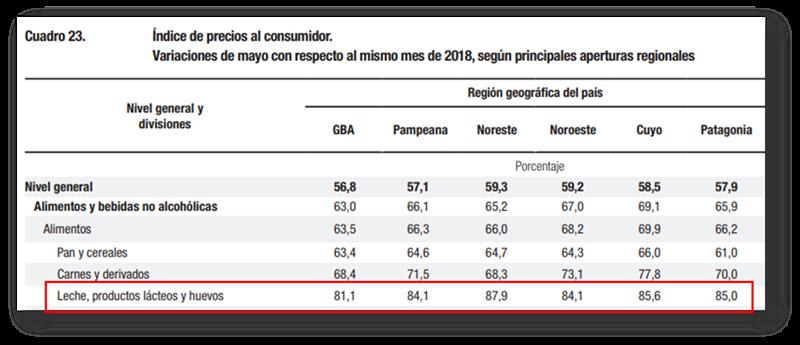 Los alimentos y bebidas no alcohólicas en general, crecieron un 2,4% en mayo de 2019 y un 64,9% en el acumulado anual. Los lácteos en particular (incluye huevos), como puede verse en los cuadros siguientes, presentaron un crecimiento mensual del 7,5% y del 81,1% respecto al mismo mes del año anterior, respectivamente para el Gran Buenos Aires.