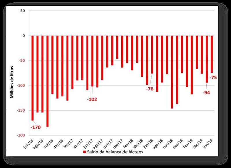 Los 6,9 millones de litros exportados por Brasil en junio de este año representaron una reducción del 35,7% con respecto a los 10,7 millones de litros de mayo en equivalente de leche. En la comparación con jun/18, esta disminución fue del 1,9%.