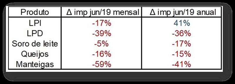 En esta coyuntura, las 5 mil toneladas de leche entera en polvo (LPI) internalizadas en junio / 19 representan una reducción del -17% en relación con el mai / 19, mientras que las 1,4 mil toneladas de leche desnatada en polvo (LPD) Representan una reducción del -39%, considerando el mismo periodo. Otros productos como los quesos, mantequillas y suero de leche también mostraron una reducción en las importaciones brasileñas en junio. La Tabla 2 muestra las variaciones de la cantidad importada de estos productos lácteos.