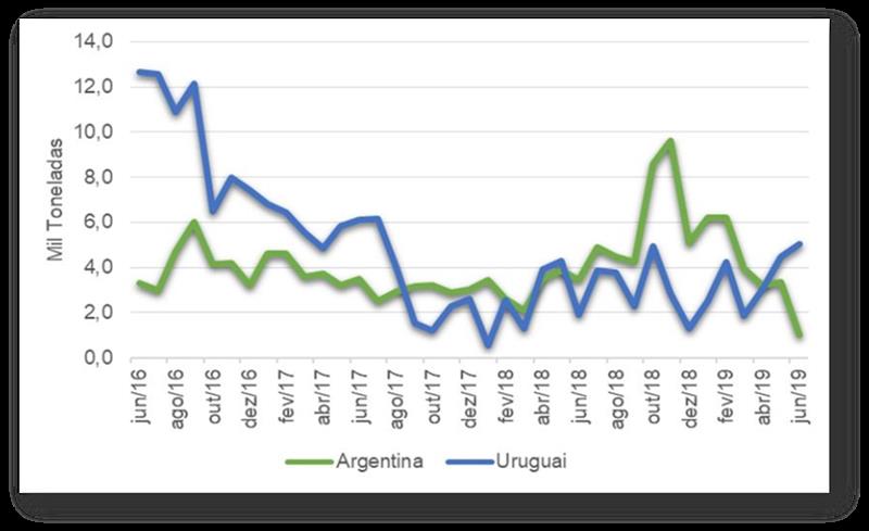 Desde el fin de las cuotas cuantitativas con origen argentino (que terminó en mayo de 2018), el mes de mayo de 2019 fue el primero en que las importaciones brasileñas de leche en polvo de Uruguay superaron las importaciones de leches argentinas en polvo. Esta diferencia se hizo más presente en junio de 2019, como se puede ver en la figura 2.