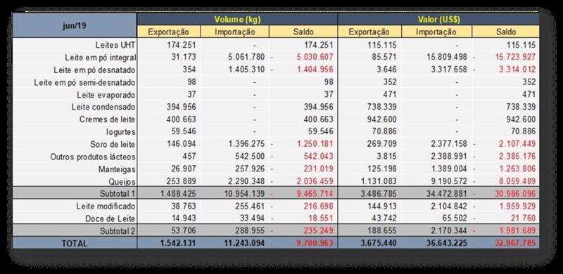 Tabla 2. Balanza comercial de leche en junio de 2019. Fuente: Preparado por MilkPoint Market basado en datos de Secex.