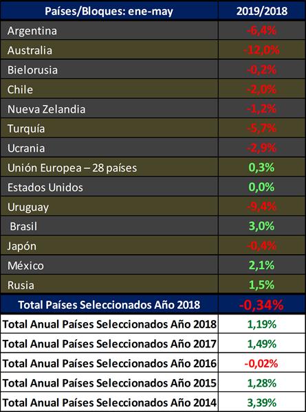 En el cuadro siguiente se toma un grupo seleccionado de los principales países productores e importadores que representan alrededor del 60% de la producción mundial de leche de vaca, en el cual se puede observar una disminución de la producción del 0,34%, para el año 2019 respecto a 2018 (período enero-mayo). Cabe mencionar que en los dos años anteriores se dio un crecimiento algo superior al 1% en cada año.