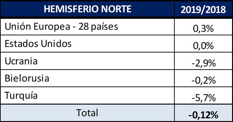 USA en un producción igual al año anterior, UE-28 con un leve crecimiento y NZ un disminución interanual acumulada del 1,2%. El comportamiento de la producción ponderada de ambos hemisferios teniendo en cuenta los países exportadores, marca una mejor perfomance para el hemisferio norte (valores casi neutros) respecto al hemisferio sur (-5,2%), teniendo en cuenta que en los países seleccionados, el hemisferio sur representa sólo el 16,5% de la producción de los países seleccionados del hemisferio norte.