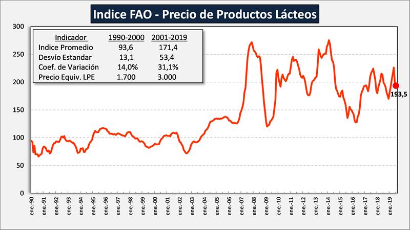 El Índice de precios de los productos lácteos, se calcula sobre la base de los precios de la manteca, la leche descremada en polvo, la leche entera en polvo y el queso. La media se pondera por las cuotas medias de exportación de los últimos años.