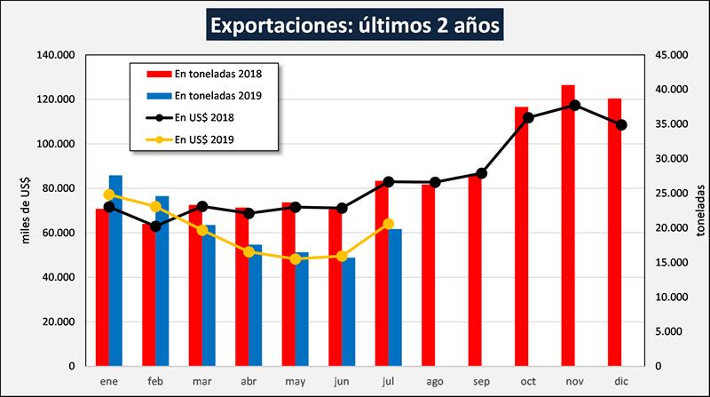 El mes de julio en particular tuvo un volumen de exportación de 19.828 toneladas por un valor de US$ 64,1 millones, esto es +26,4% y +29,2% comparado con el mes anterior, respectivamente. Como puede verse en el gráfico de abajo, el incremento del mes de julio revierte una tendencia de caída que se venía dando en los seis meses anteriores.