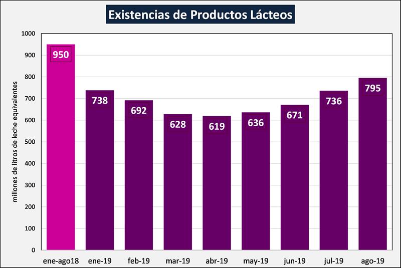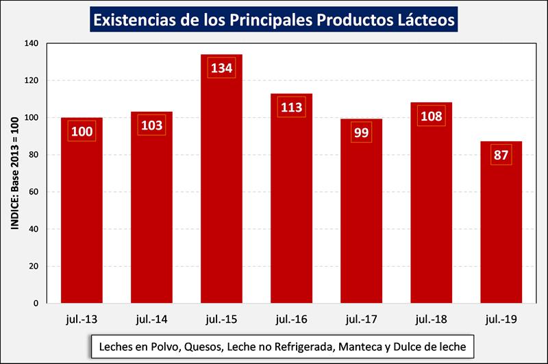 Según los datos del panel de industrias lácteas establecido a partir del relevamiento coyuntural de la Resolución 230/16 e información histórica de la Resolución 7/14, ambas de la SAGyP, las existencias acumuladas en 2019 hasta el mes de julio, son un 29,6% y 30,4% inferiores a igual período dela año anterior en volumen de productos y leche equivalente (litros de leche cruda necesarios para producir esos productos según los coeficientes de conversión de la Disposición 1/2018 de la DNL-MPyT), respectivamente.