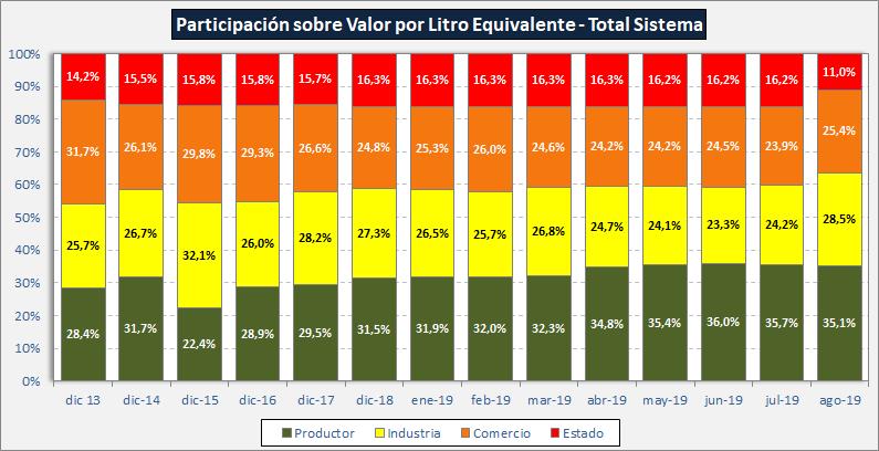 La participación del productor el total del sistema fue para agosto del 35,1%, algo inferior a los dos meses anteriores (máximo de la serie en junio de 2019) pero aún bastante por encima de la media históricas del 29,6%. Una situación similar se da para la participación en los valores finales de mercado interno y de salida de fábrica total del sistema (valor al que vende la industria).