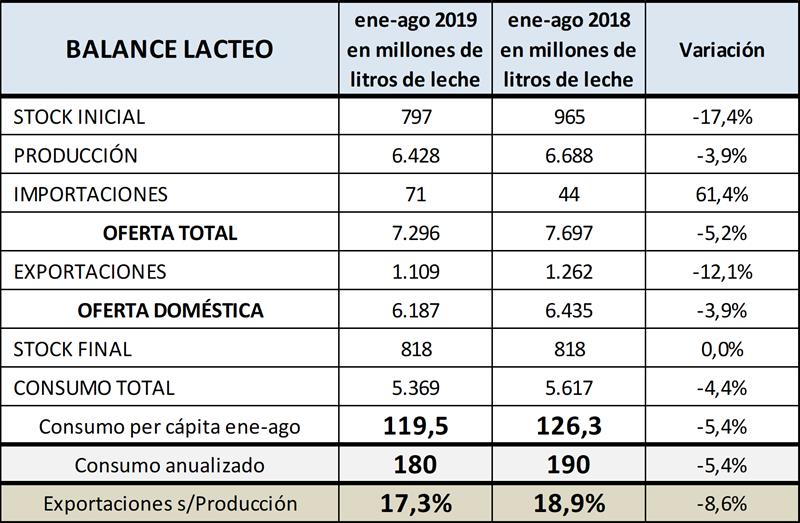 El balance lácteo estimado por OCLA arroja las siguientes cifras a agosto de 2019: