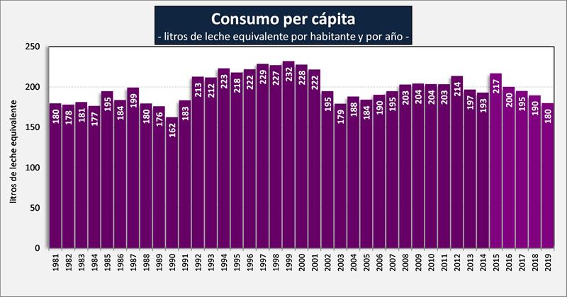 El consumo per cápita anualizado en base a los datos a agosto, arroja un valor de 180 litros por habitante y por año, lo que representa una disminución del 5,4% respecto al año anterior.