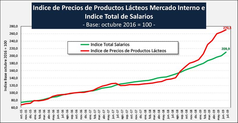 El gráfico anterior se construye sobre la base de los precios por litro de leche equivalente a consumidor final que mensualmente calcula IAPUCo y el Índice de Salarios Totales: Salario Registrado (privado y público) y Salario Privado no Registrado y utilizando la metodología para el cálculo del coeficiente de variación de salarios (C.V.S.) del Decreto 1242/2002, en ambos casos se parte de un número índice igual 100 para el mes de octubre de 2016.