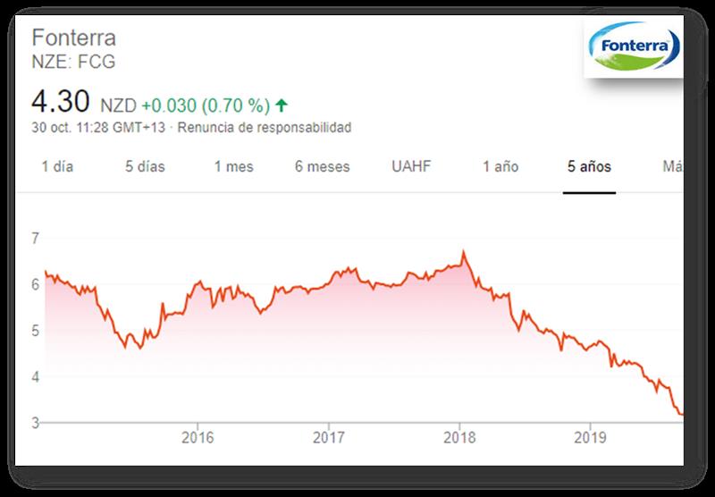 Las acciones de Fonterra se han derrumbado, llegando a un mínimo de NZ$ 3,15. Al momento de escribir, no había habido una gran mejora, sólo tres centavos a NZ$ 3,18. El precio más alto de la acción de la cooperativa ha sido NZ$ 6,56 en 2012, más del doble del precio actual.